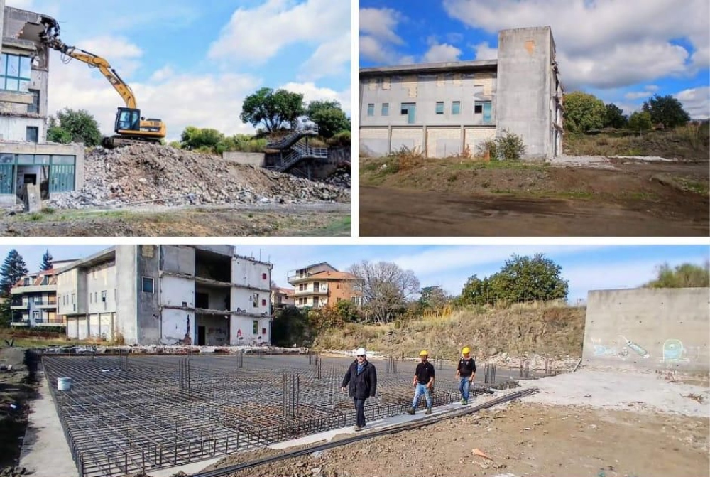 È già stata completata la demolizione di una prima parte dell’ex casa albergo, un edificio ormai fatiscente e pericoloso, e si procede speditamente con la costruzione del nuovo edificio da adibire a mensa scolastica, a servizio della nascente scuola dell’infanzia.