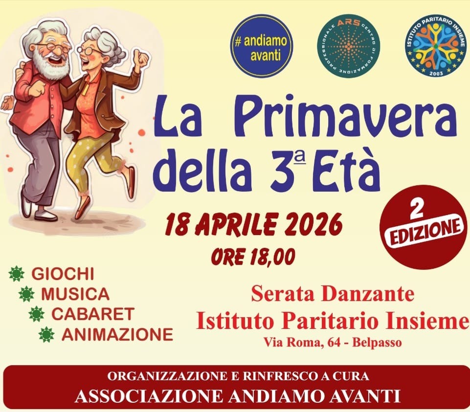 E’ arrivata la “Primavera”. Così l’associazione “Andiamo Avanti” vuole festeggiare l’arrivo di questa stagione che significa risveglio, determinazione e voglia di vivere coinvolgendo in un evento tanto adesso i “ragazzini” e le “ragazzine” della terza età. Tutto ciò si concretizzerà con la seconda edizione de “La Festa di Primavera della 3° età” che si svolgerà sabato 18 aprile dalle ore 18 all’interno dei locali dell’Istituto Paritario “Insieme” sito in via Roma 64 a Belpasso. Una serata danzante con giochi, musica, cabaret, animazione dedicata ai nostri “Nonni” e “Nonne” e realizzata in sinergia con l’istituto di formazione “ARS” e l’Istituto Paritario “Insieme”.