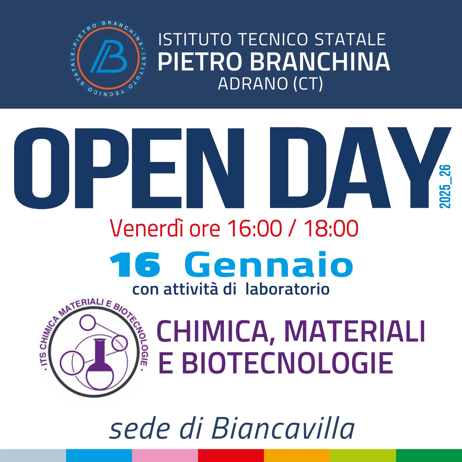 Si svolgerà il prossimo 16 gennaio, dalle ore 16:00 alle ore 18:00, l’open day dell’Istituto Tecnico Tecnologico di Biancavilla – sede distaccata dell’ITS Pietro Branchina di Adrano. Un momento importante, per tanti giovani studenti che si troveranno da qui a breve a dover scegliere il proprio futuro attraverso l’iscrizione ad un istituto di secondo grado. Un’offerta accattivante, quella proposta dall’ex industriale di Biancavilla, con 2 corsi di studi, uno quadriennale e l’altro quinquennale.