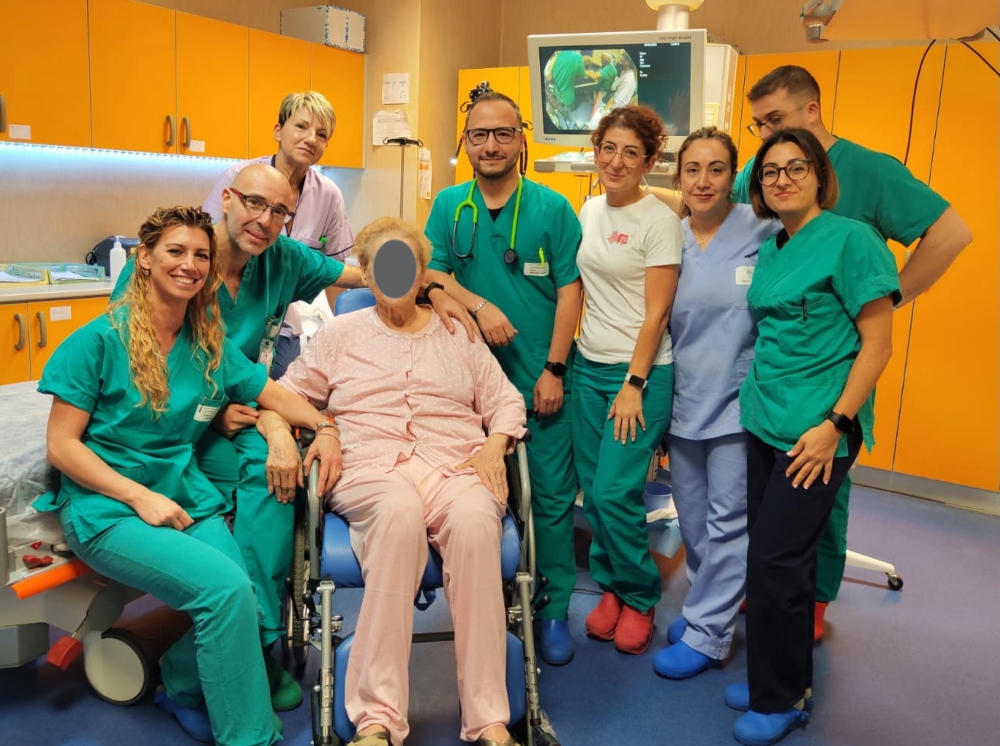 Il direttore della Chirurgia di Vittoria valutata la complessità e la rischiosità di un intervento tradizionale, ha contattato Catarella del Garibaldi-Nesima, dove nel 2024 era già stato eseguito con successo un caso analogo. In sinergia con Salvatore Piro e Salvatore Lumera dell’Unità di Medicina, si è deciso per il trasferimento della paziente presso il presidio etneo. Il giorno successivo, l’équipe multidisciplinare composta da endoscopisti (Domenico Catarella, Dario D’Agostino e Carlo Petruzzellis), internisti (Salvatore Piro e Salvatore Lumera) e anestesisti (Concetta Fazzino e Giuseppe Calabrese) ha eseguito la procedura endoscopica.