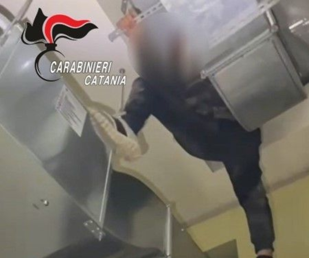 Sospettando pertanto che ci fosse ancora qualcuno all’interno del locale i militari, pochi istanti dopo, osservando il soffitto, hanno notato il lucernario danneggiato e, in tale frangente, hanno sorpreso un individuo, che tentava di nascondersi a cinque metri di altezza tra i pannelli coibentati e i tubi di ventilazione della cucina.