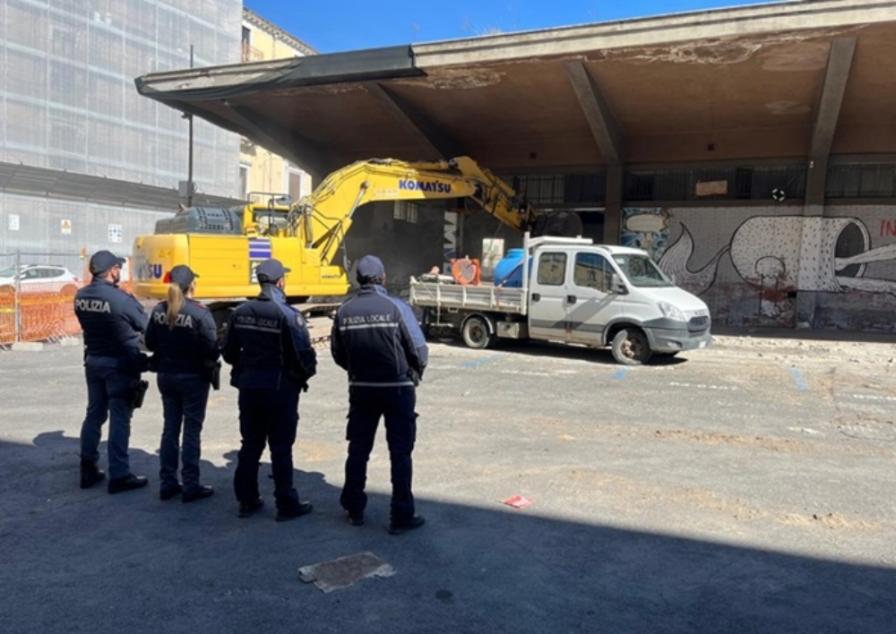 Tutta l’area di cantiere è stata presidiata da un dispositivo di sicurezza composto da ufficiali, ispettori e agenti della Polizia Locale e della Polizia di Stato.