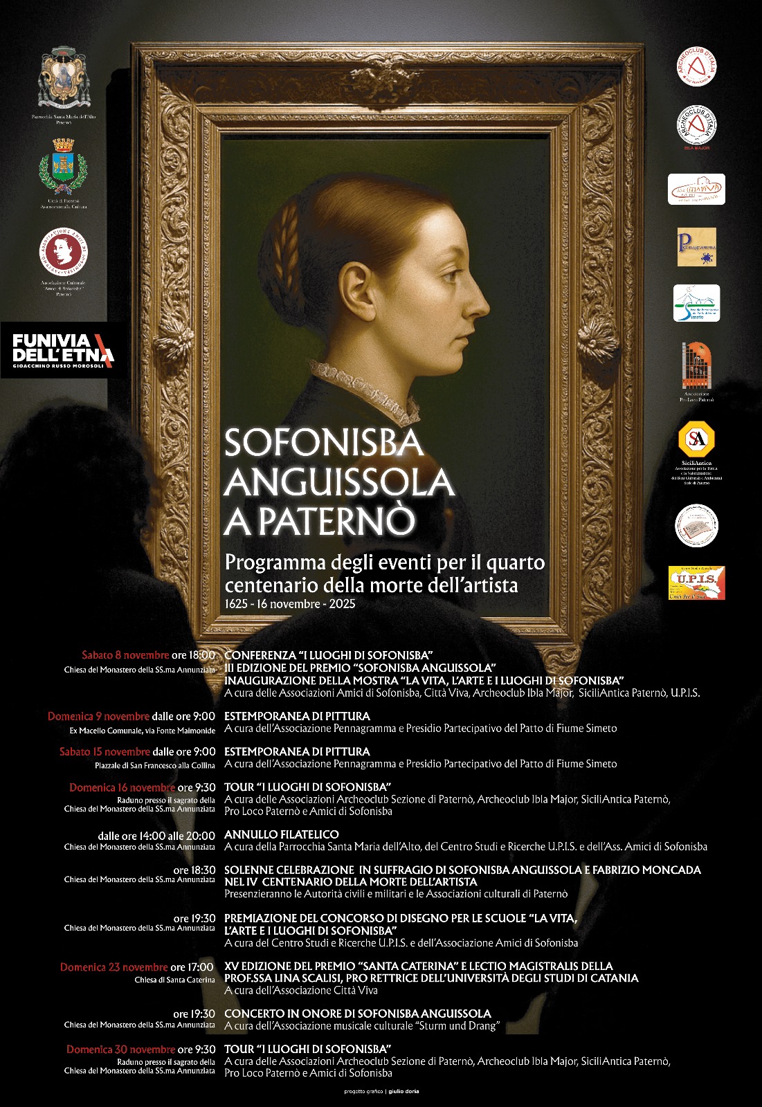 cittadina etnea è profondamente legata a Sofonisba Anguissola, luogo in cui la pittrice visse per alcuni anni della sua vita, sposa del nobile Fabrizio Moncada. Più associazioni, insieme alla Parrocchia di Santa Maria dell’Alto, hanno lavorato per stilare un programma fitto di appuntamenti con eventi culturali che si protrarranno per tutto il mese. In campo le associazioni: Amici di Sofonisba; Archeoclub Paternò; Archeoclub Ibla Major Paternò; Città Viva; Pennagramma; Presidio partecipativo del Patto di fiume Simeto; Pro Loco Paternò; SiciliAntica Paternò; Sturm und drang e Upis. Primo appuntamento, come detto, il prossimo 8 novembre, con la conferenza “I luoghi di Sofonisba”, in programma alle ore 18, presso la Chiesa del Monastero della SS.ma Annunziata. A seguire, la III edizione del premio “Sofonisba Anguissola” e l’inaugurazione della mostra dei disegni realizzati dagli studenti di Paternò, “La vita, l’arte i luoghi di Sofonisba”. Seguiranno: estemporanee di pittura, tour guidati, concerti musicali, un annullo filatelico e la premiazione del concorso di disegno lanciato con le scuole. Il calendario degli appuntamenti verrà presentato in dettaglio venerdì prossimo, 7 novembre, alle ore 10, nella Chiesa del Monastero della SS.ma Annunziata, nel corso di una conferenza stampa.