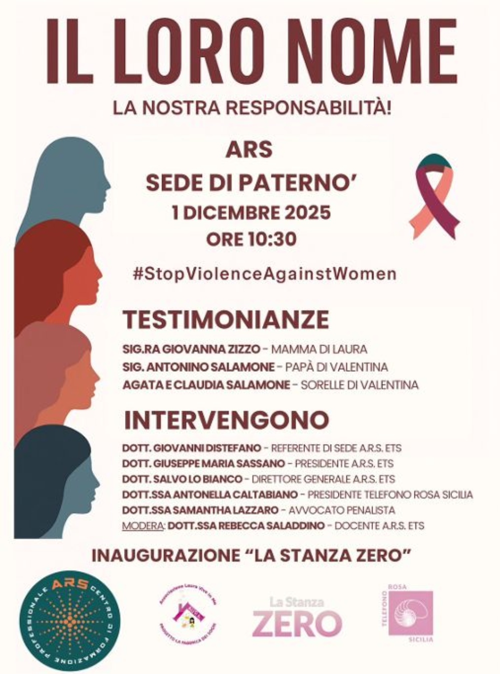 Il tutto nasce dalla collaborazione tra Telefono Rosa Sicilia e ARS-Centro di Formazione Professionale, da sempre impegnato nella tutela e nella prevenzione contro ogni forma di violenza. Durante l’evento in programma domani primo dicembre dal titolo “Il loro nome, la nostra responsabilità!” sarà inaugurata la terza “Stanza ZERO” nell’Isola.