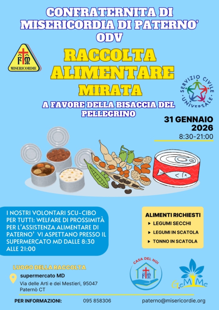 Destinatari dell’iniziativa gli utenti della mensa sociale “La Bisaccia del Pellegrino”, realtà con cui la locale Misericordia vanta una collaborazione consolidata ormai da diversi anni. In particolare, ai cittadini paternesi, verrà chiesto di donare tonno in scatola, legumi in scatola, legumi secchi ma non solo.