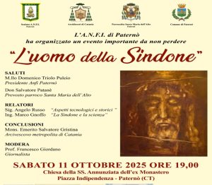 L’A.N.F.I. (Associazione Nazionale Finanzieri d’Italia), sezione di Paternò, nell’ambito di uno scambio culturale con l’associazione consorella di Bagheria, ha promosso un convegno rivolto non solo ai propri associati, ma aperto all’intera comunità paternese. Un appuntamento di fine anno sociale dal titolo impegnativo, volto a offrire spunti di riflessione sull’enigma della Sindone e, magari, a sgombrare la mente da qualche dubbio.