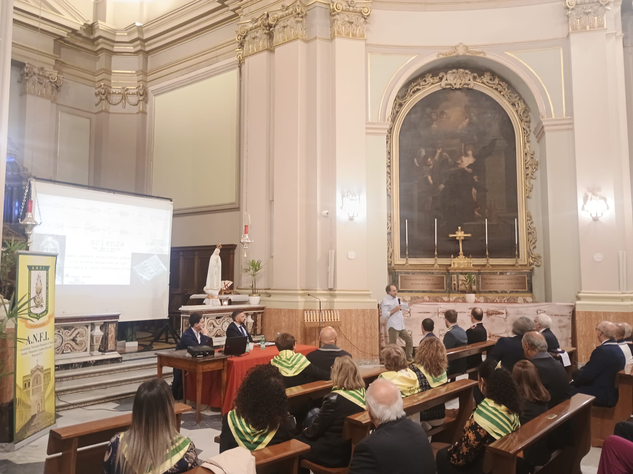 Proprio in quella stessa aula eucaristica, una decina d’anni fa, in occasione della chiusura dell’Anno della Fede, l’allora parroco don Salvatore Alì ospitò il noto scienziato e professore Antonino Zichichi, trasformando la Chiesa in un’aula universitaria dibattendo su fede e mistero. In quell’occasione sedevano fianco a fianco gente comune e professionisti: medici, insegnanti, avvocati, religiosi, studenti di ogni età. Sabato sera si è ripetuta la stessa atmosfera: la scienza moderna è tornata a confrontarsi con il lenzuolo più discusso della storia.