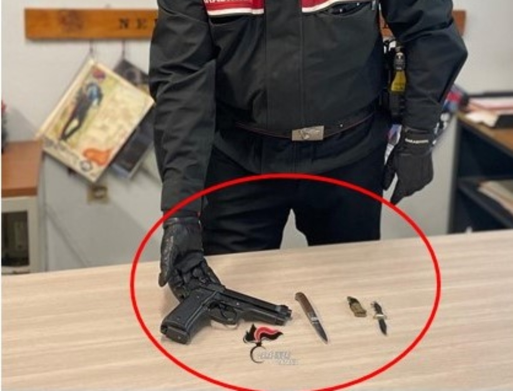 A seguito della perquisizione dell’autovettura i Carabinieri, sotto il sedile lato guida dell’autovettura del giovane, hanno scovato una riproduzione a salve di una pistola Beretta cal. 9mm privata però del tappo rosso, una confezione di relative munizioni, nonché un coltello a serramanico della lunghezza di 15 centimetri nel vano portaoggetti dell’autovettura.