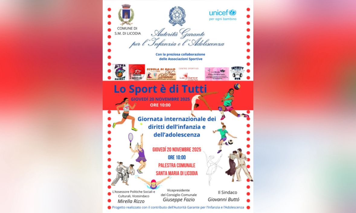 Tutto pronto a Santa Maria di Licodia per l’evento “Lo Sport è per tutti” che si terrà domani 20 novembre 2025. Una giornata speciale dedicata ai bambini e agli adolescenti che vivrà il suo momento clou a partire dalle 10:00 all’interno della Palestra Comunale di via Bartali – dopo la sfilata delle Associazioni e degli Istituti Scolastici – e che coniuga l’attività sportiva con la celebrazione della Giornata Internazionale dei Diritti dell’Infanzia e dell’Adolescenza, ricorrenza che da oltre trent’anni ricorda l’importanza di tutelare i più piccoli. L’iniziativa nasce dalla collaborazione virtuosa tra il Comune di Santa Maria di Licodia, l’Autorità Garante per l’Infanzia e l’Adolescenza, UNICEF e le principali associazioni sportive del territorio. La presenza di realtà come Aitna Basket, Shotokan Karate-Do, la Scuola di Ballo Nuovo Danza, il Centro Sportivo Lia Dance, la Scuola Teatro e Danza “Ma non l’Etoile” e l’Infinity Gym testimoniano quanto lo sport possa diventare un potente strumento educativo e di inclusione sociale.