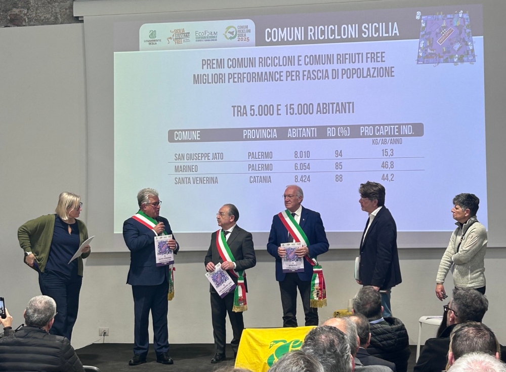 Si è tenuta presso i Cantieri Culturali alla Zisa di Palermo, la presentazione del Dossier “Comuni Ricicloni Sicilia 2025” curato da Legambiente Sicilia. Anche quest’anno il Comune di Santa Venerina ha ricevuto il premio “COMUNE RIFIUTI FREE” grazie ai risultati raggiunti nell’anno 2024: raccolta differenziata pari a 88,5% e produzione di residuo secco di 44,2 kg per abitante all’anno.