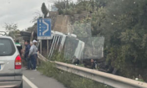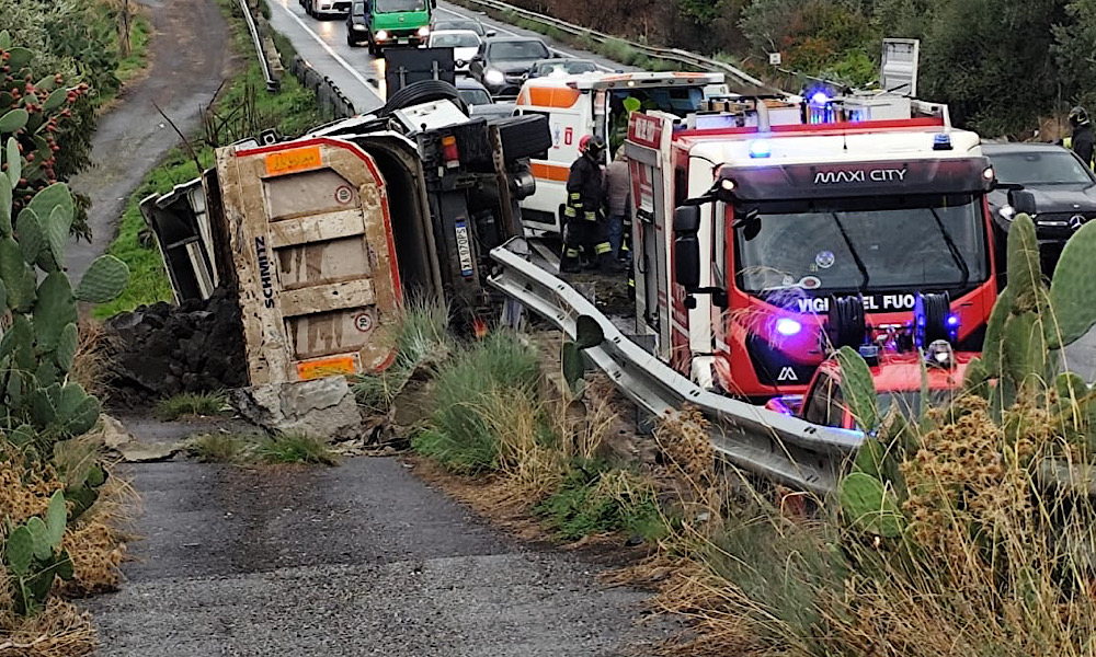 Incidente questa mattina sulla Ss284 nella corsia di marcia direzione Adrano poco distante dallo svincolo Santa Maria di Licodia-Belpasso. A ribaltarsi e finire fuori strada, per cause da accertare, un camion che viaggiava in direzione Catania e che avrebbe invaso la corsia di marcia opposta. Sul posto è intervenuta un’ambulanza del 118, i Vigili del Fuoco del distaccamento dí Paternò e l’elisoccorso che é atterrato poco distante dal luogo dell’incidente. Secondo le prime informazioni il conducente, un 66enne di Belpasso, avrebbe riportato diversi traumi ma le sue condizioni non sarebbero critiche. L’uomo è stato trasportato al Pronto Soccorso da una delle due ambulanze intervenute e non è stato necessario ricorrere al trasferimento con l’elisoccorso che ha poi fatto rientro al Cannizzaro. A procedere con i rilievi e a regolare il traffico andato in tilt in entrambe le direzioni, i Carabinieri della Compagnia di Paternò.