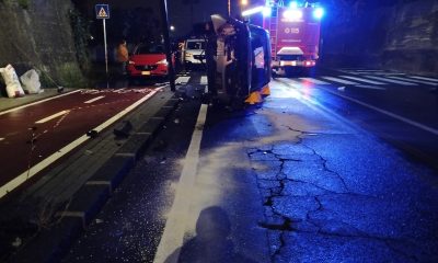 Ford Focus si schianta contro palo della luce e finisce la sua corsa ribaltandosi